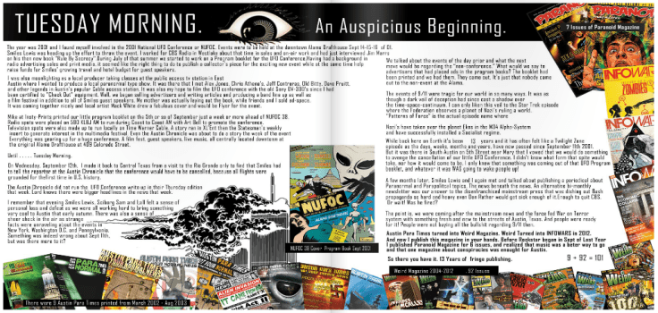 Check out the 2-page spread on page 25. It’s a flashback retrospective on the long-strange trip from producing the conference program for the ill-fated 38th annual National UFO Conference slated for September 14-16th, 2001 and the launch of Austin Para Times, which became Weird Magazine, which got bought by Alex Jones, and morphed into InfoWars Magazine, and ultimately led Russell to briefly publish Paranoid Magazine and now for a year, Rockstar Magazine.